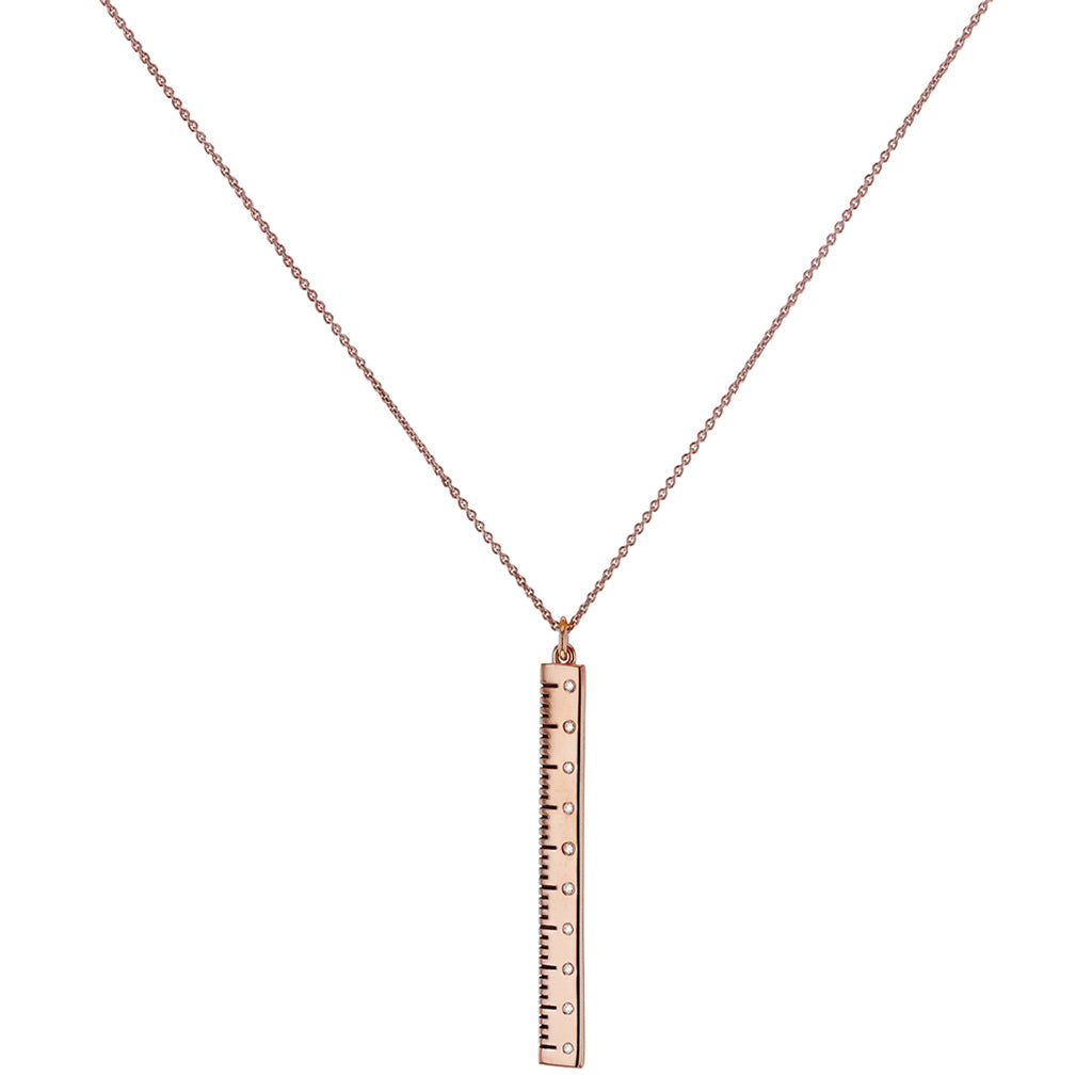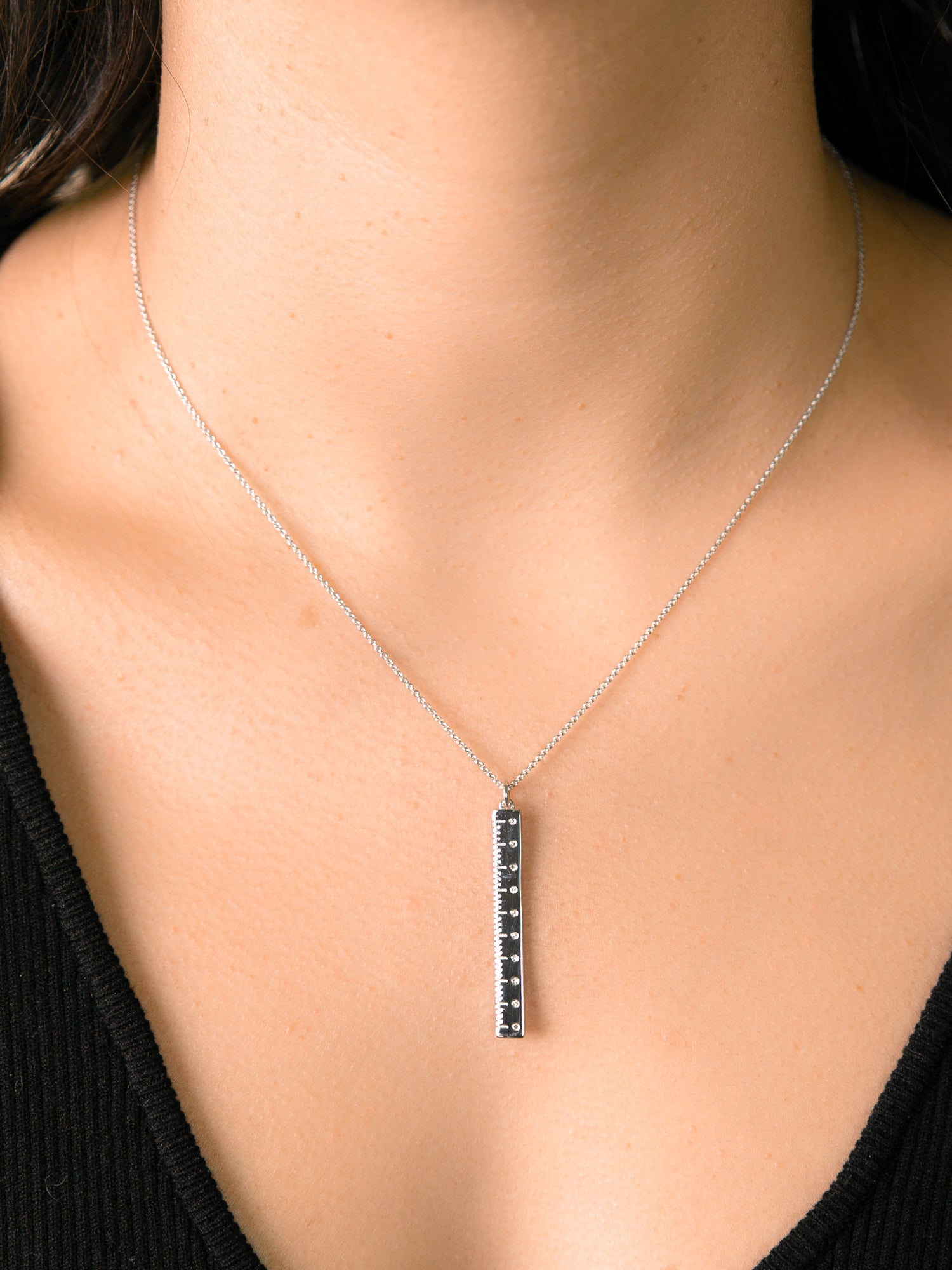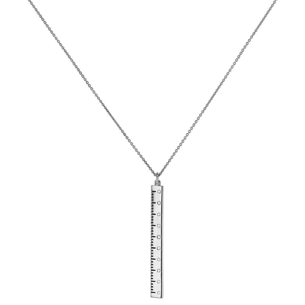 This miniature ruler necklace, designed by Joan Hornig for The Female Quotient, is in 18K yellow gold vermeil, 18K rose gold vermeil or sterling silver with ethically sourced, natural round diamonds. It is hung on an adjustable 20" chain.