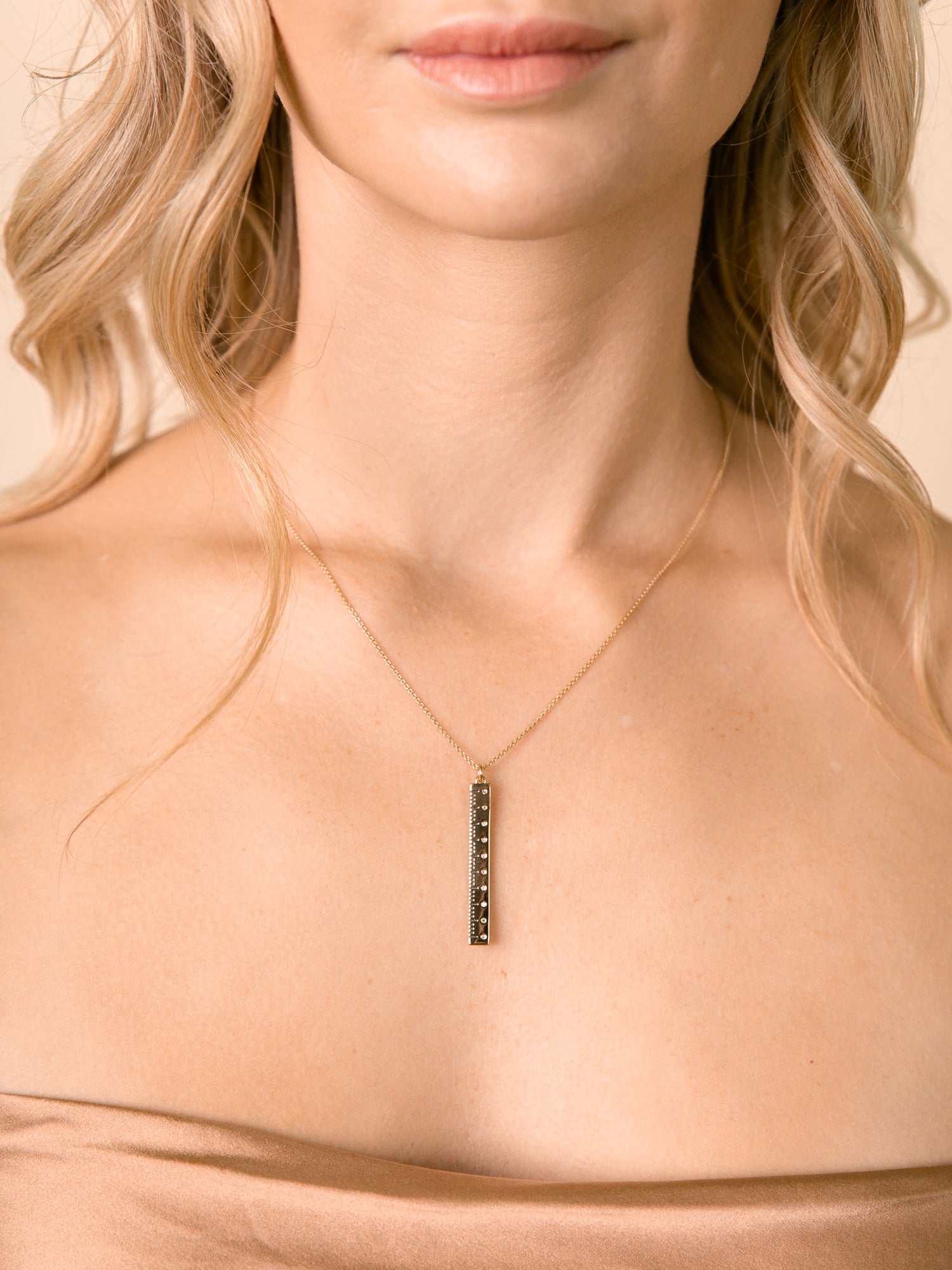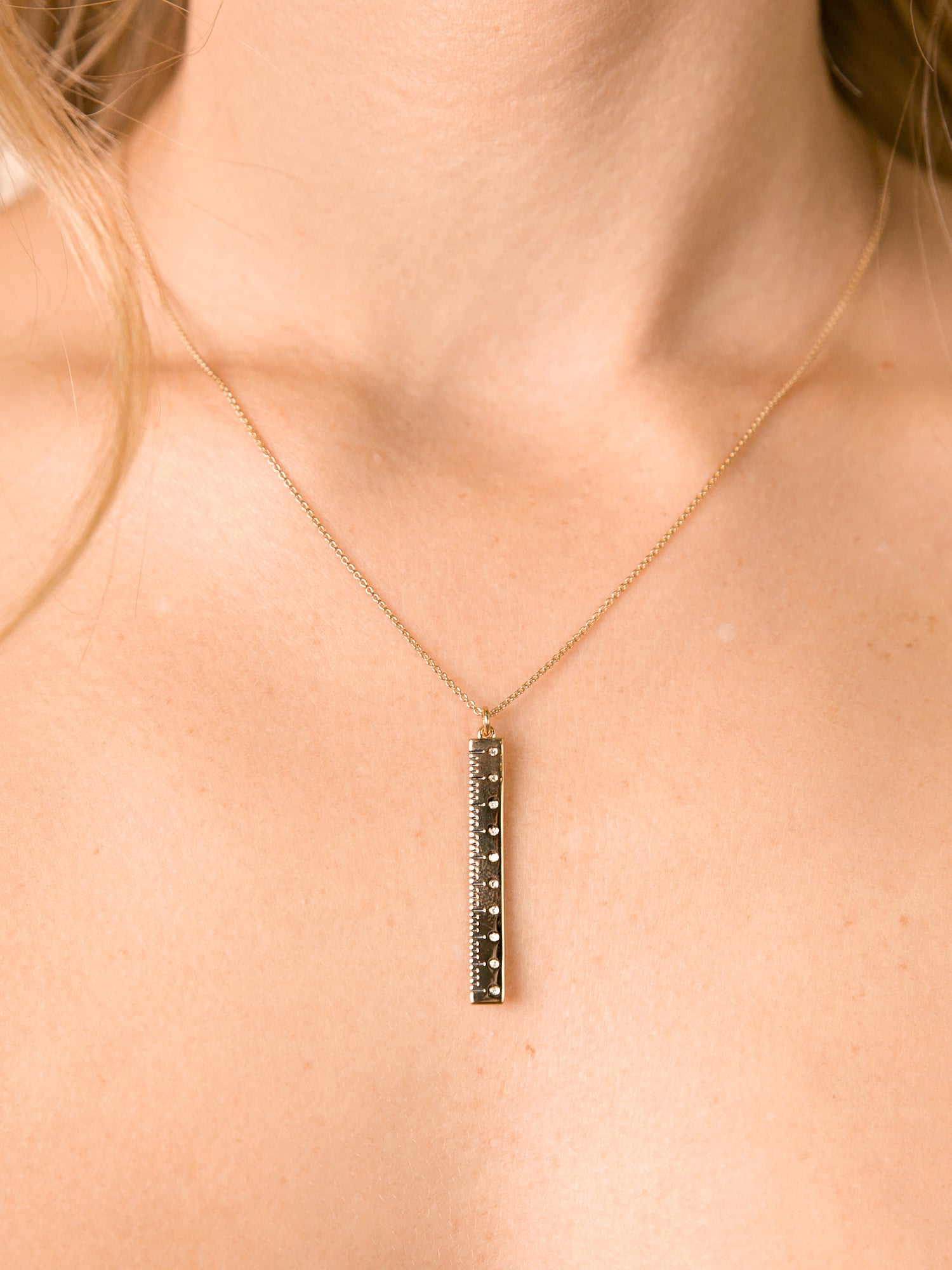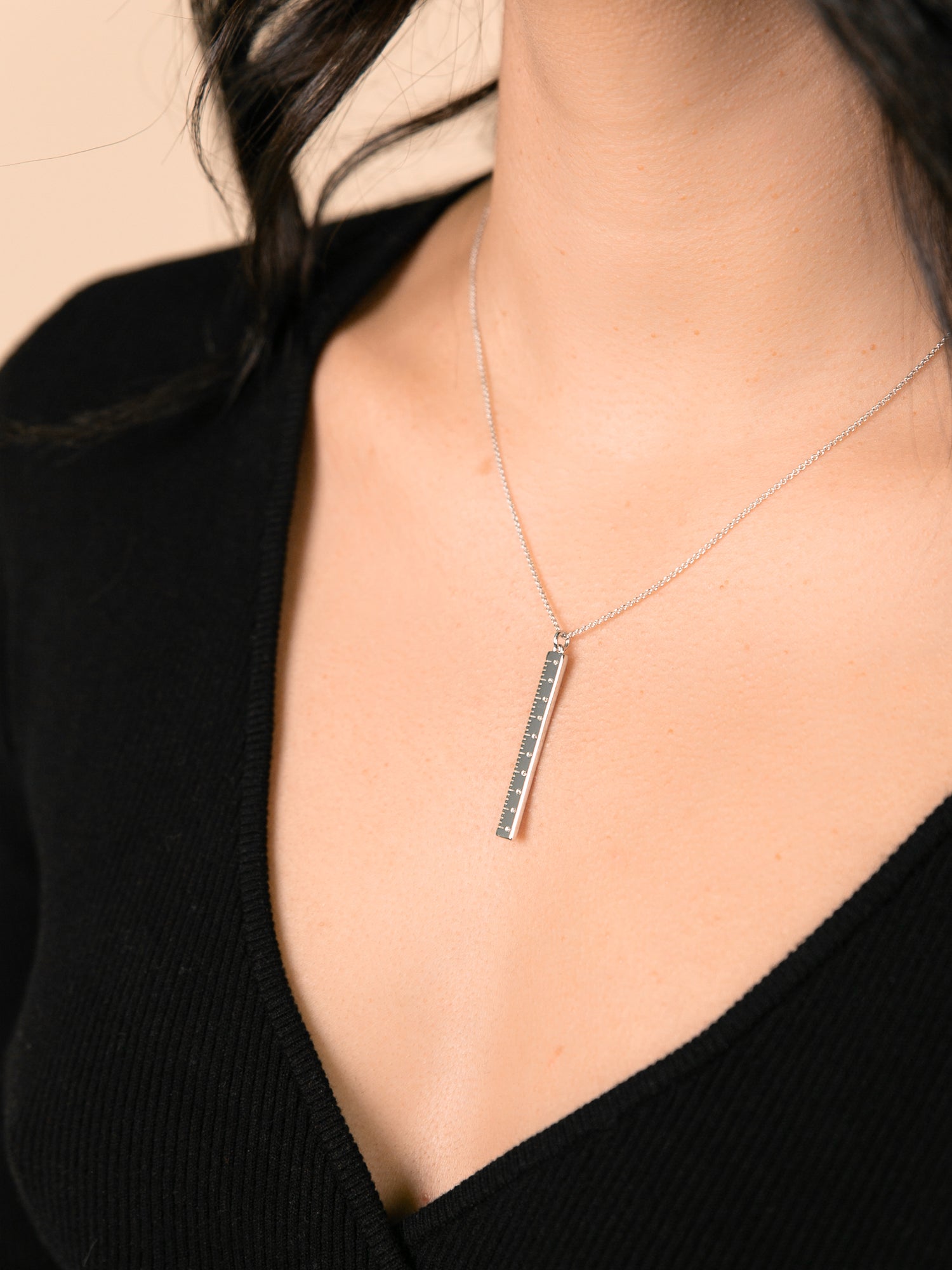 This miniature ruler necklace, designed by Joan Hornig for The Female Quotient, is in 18K yellow gold vermeil, 18K rose gold vermeil or sterling silver with ethically sourced, natural round diamonds. It is hung on an adjustable 20" chain.