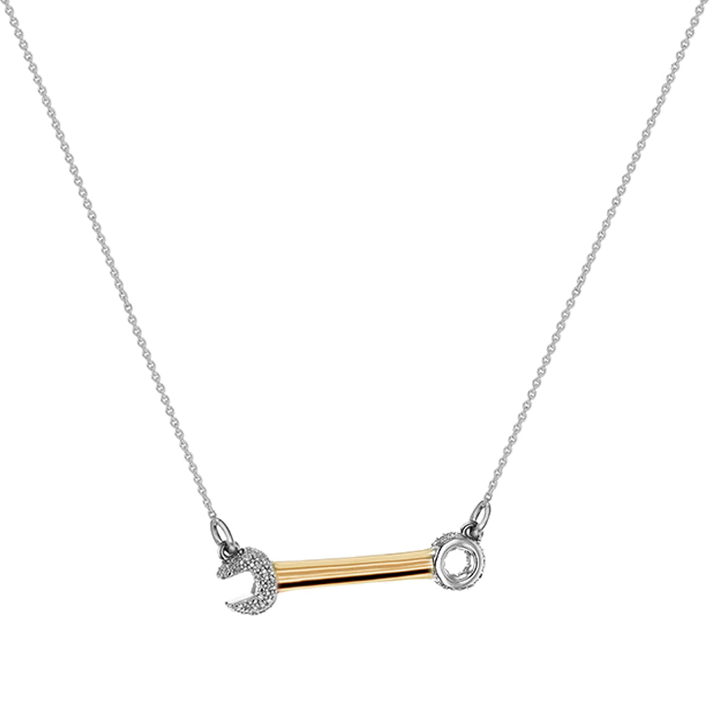 This miniature wrench necklace, designed by Joan Hornig for The Female Quotient, is made in 18K yellow gold vermeil, 18K rose gold vermeil or sterling silver with ethically sourced, natural round diamonds. It is hung on an adjustable 18" chain.