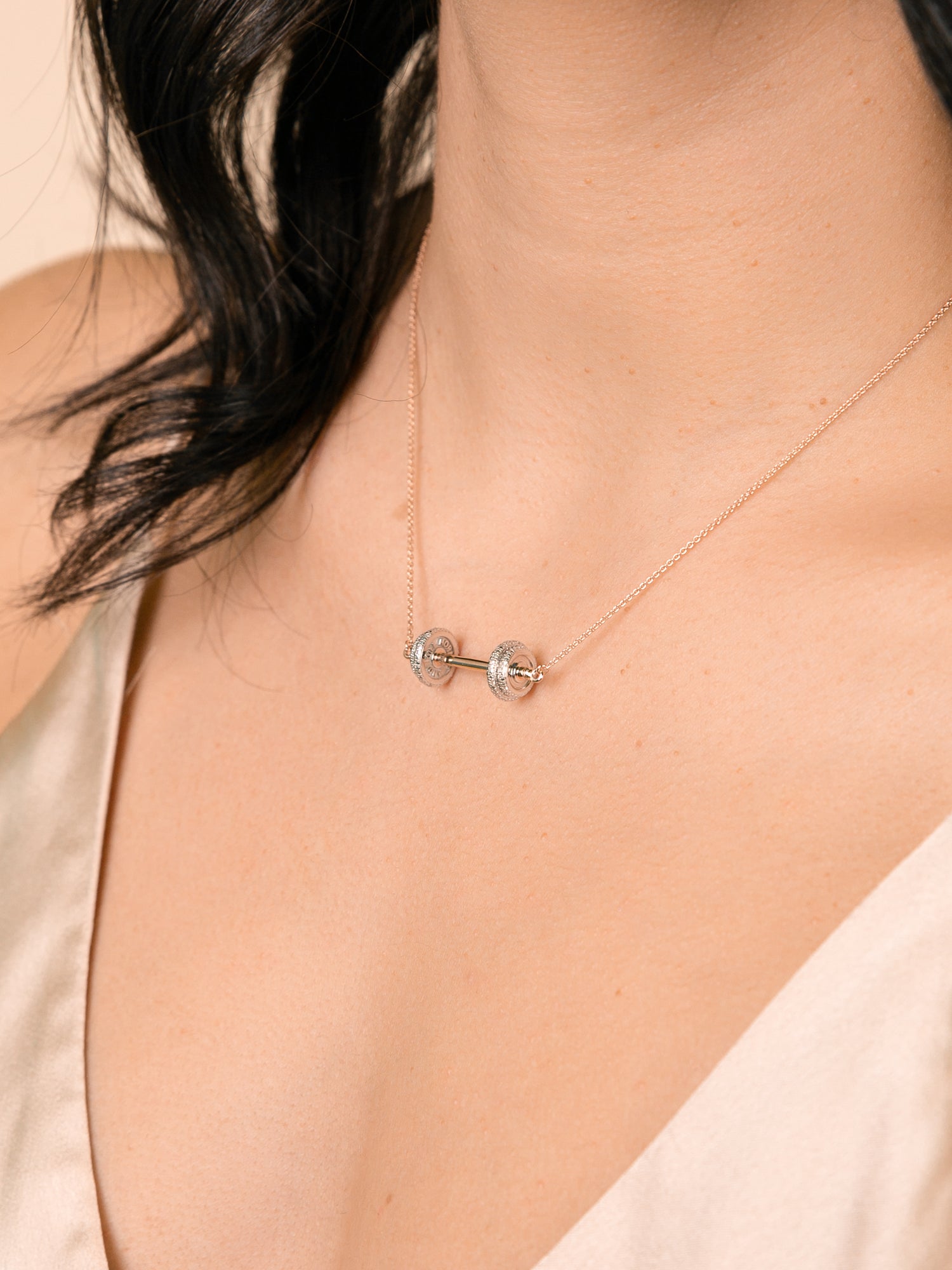This piece of jewelry is part of our Talkin’ Tools® Collection, which symbolizes different tools for female advancement and unlocks stories of girls around the world. This necklace is a barbell that illustrates that women are "fit to succeed" in the workplace, in the home and wherever they put their energy.