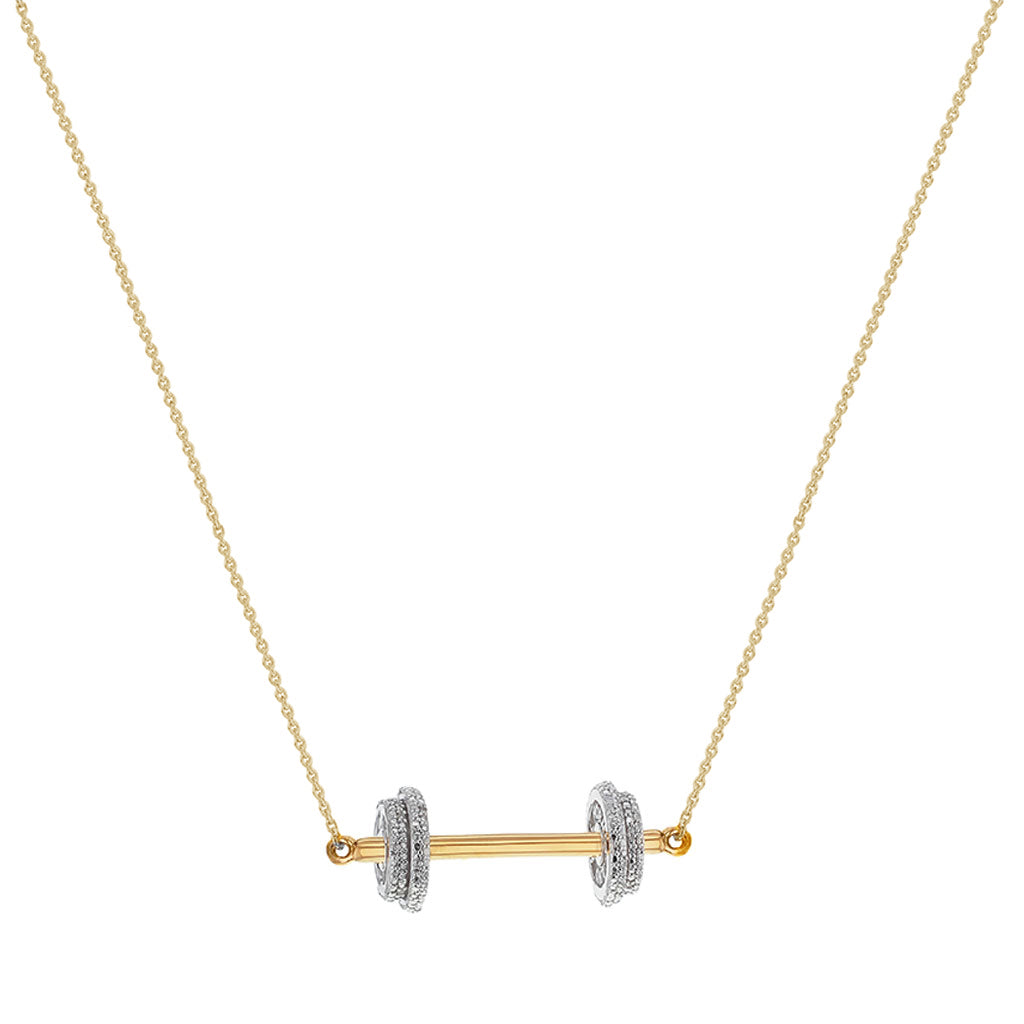 This miniature barbell necklace, designed by Joan Hornig for The Female Quotient, is made in 18K yellow gold vermeil, 18K rose gold vermeil or sterling silver with ethically sourced, natural round diamonds. It is hung on an adjustable 18" vermeil chain.