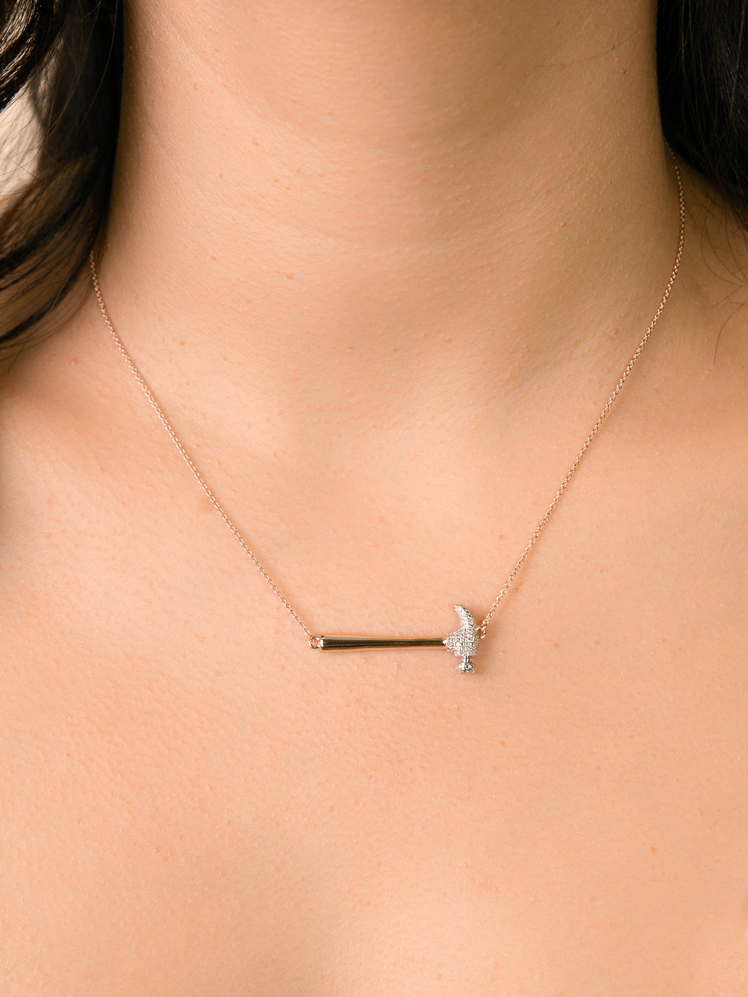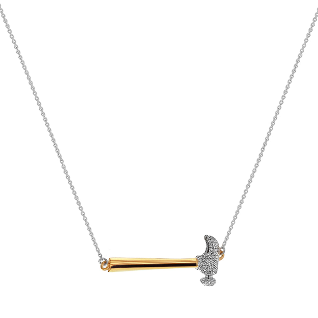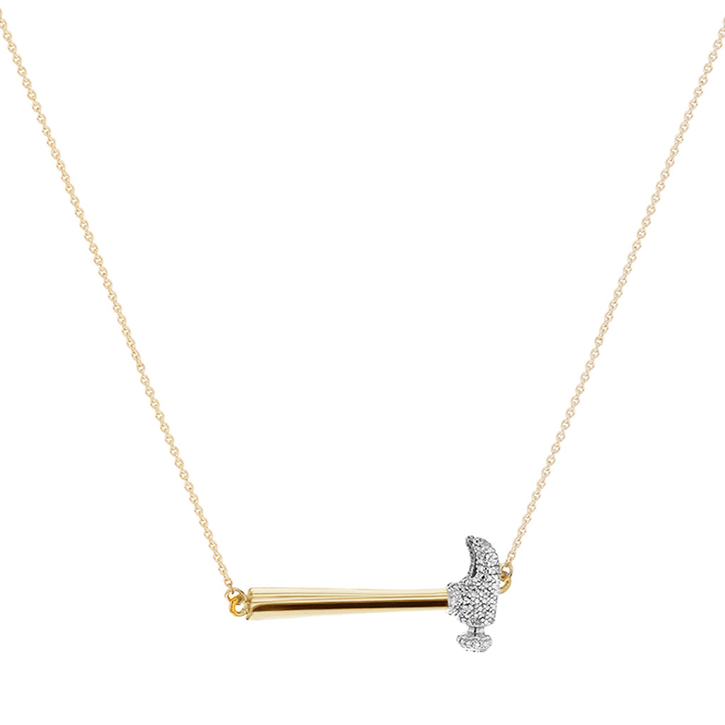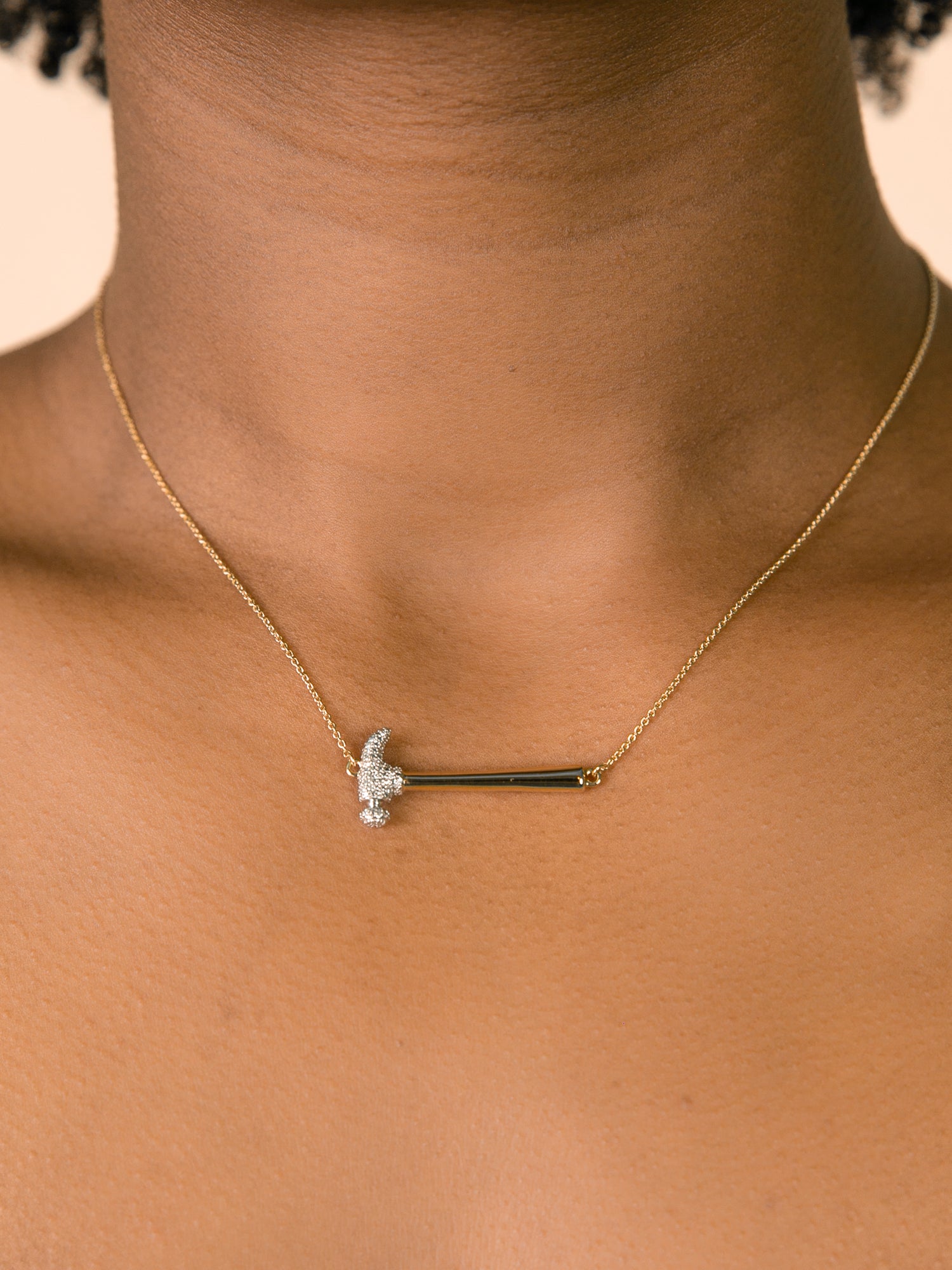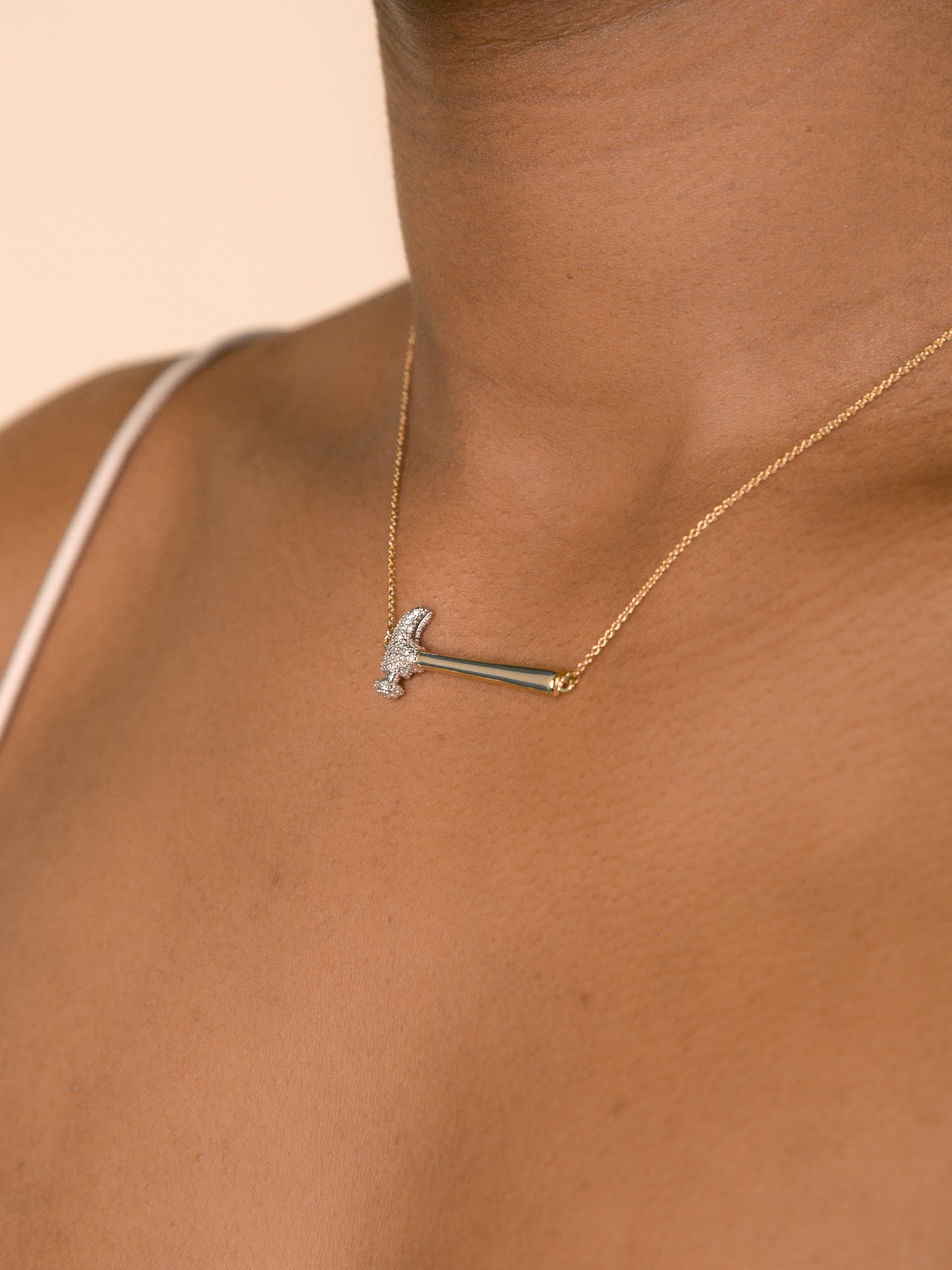 This miniature hammer necklace, designed by Joan Hornig for The Female Quotient, is made in 18K yellow gold vermeil, 18K rose gold vermeil or sterling silver with ethically sourced, natural round diamonds. It is hung on an adjustable 18" chain.
