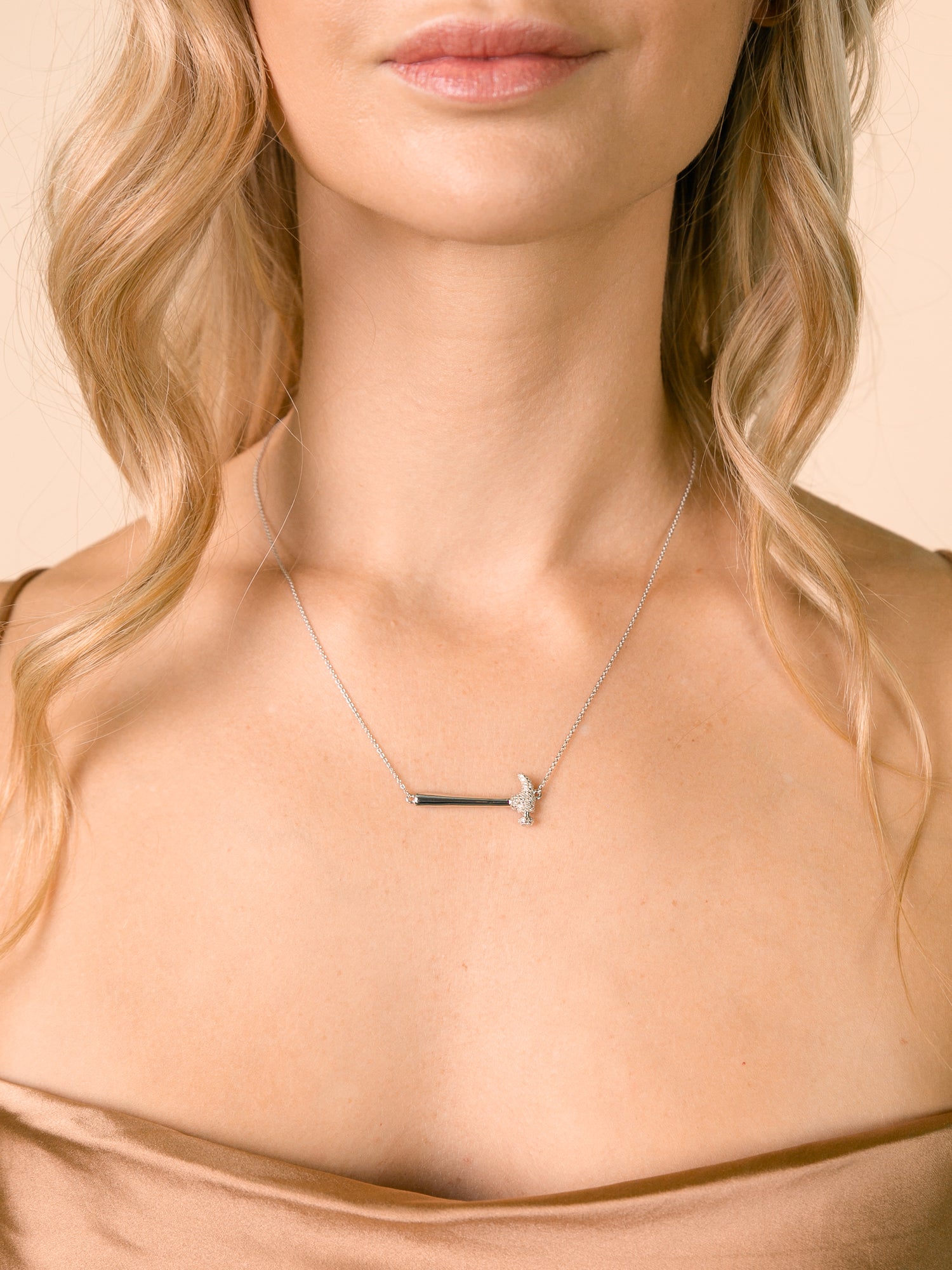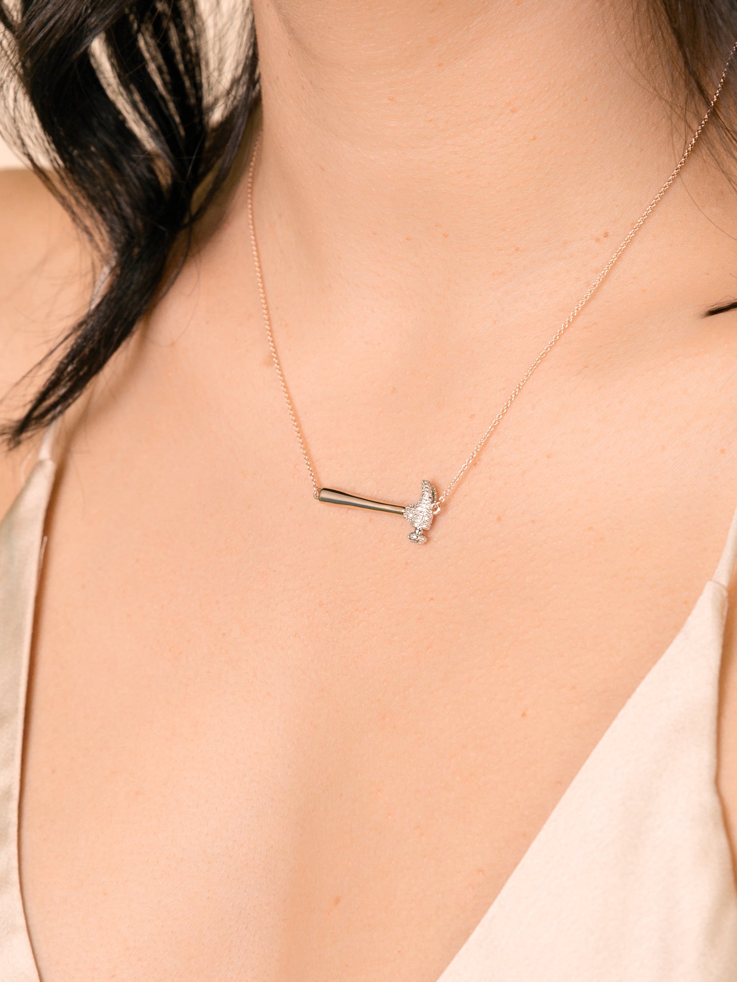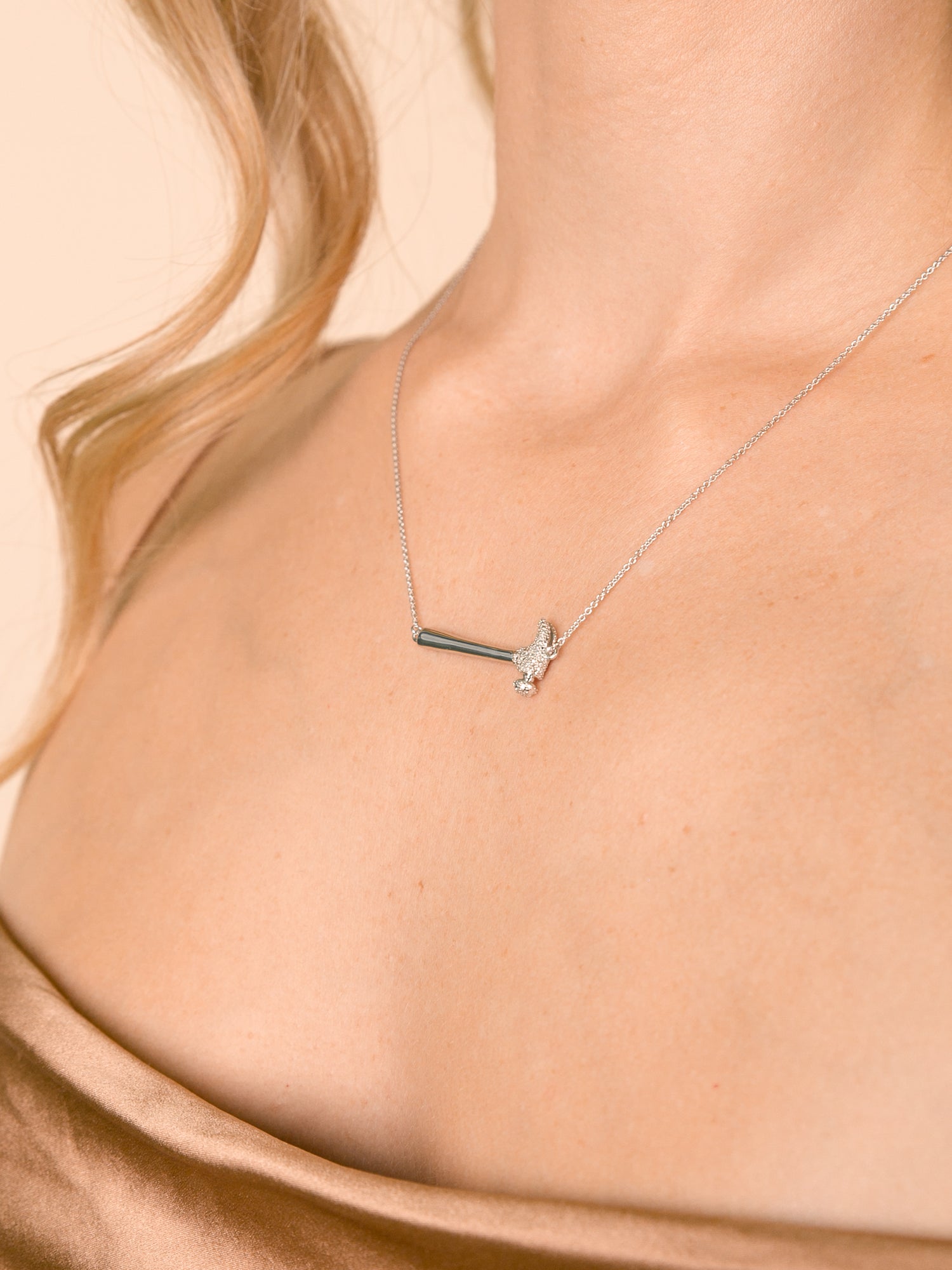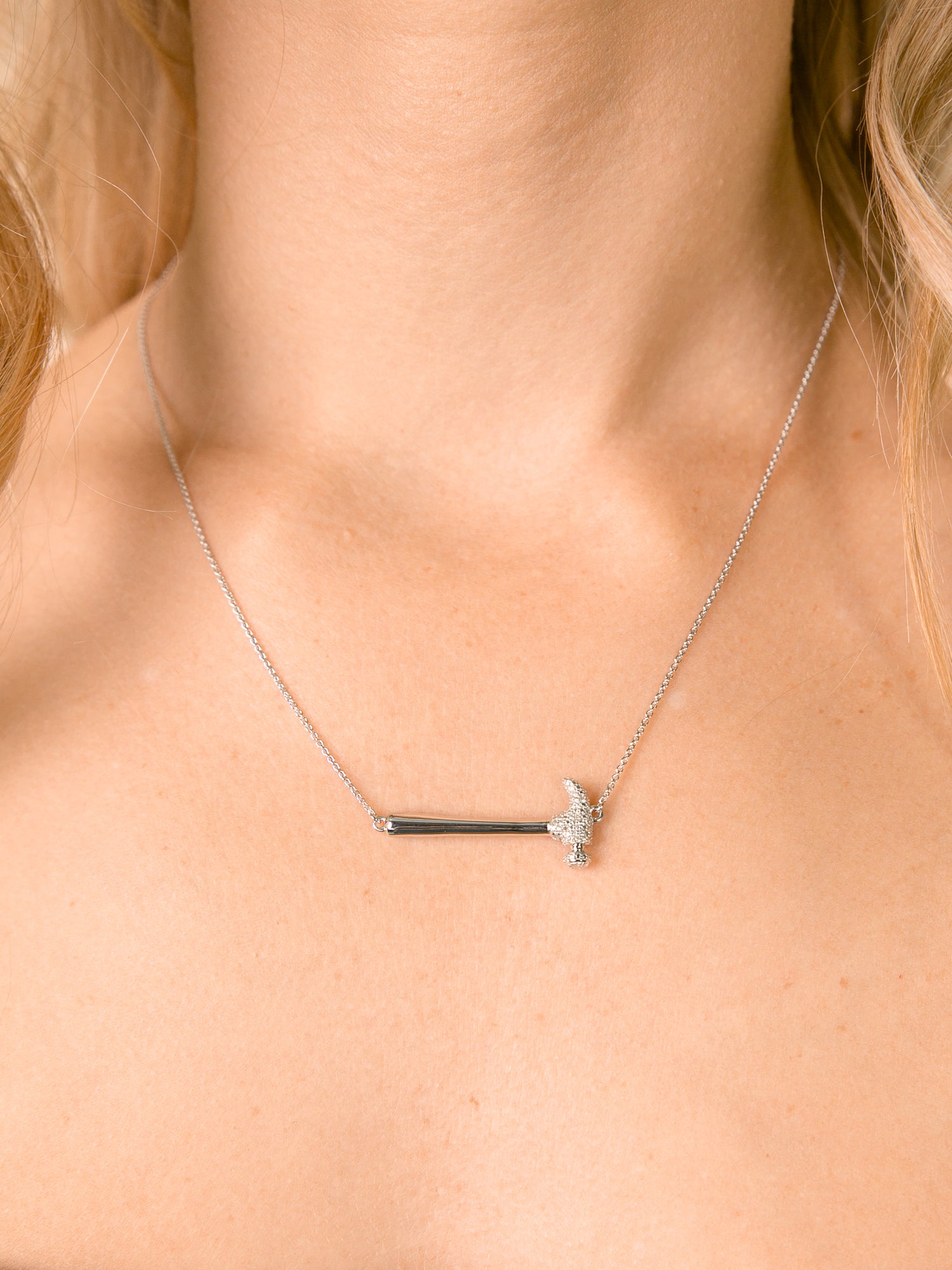 This miniature hammer necklace, designed by Joan Hornig for The Female Quotient, is made in 18K yellow gold vermeil, 18K rose gold vermeil or sterling silver with ethically sourced, natural round diamonds. It is hung on an adjustable 18" chain.