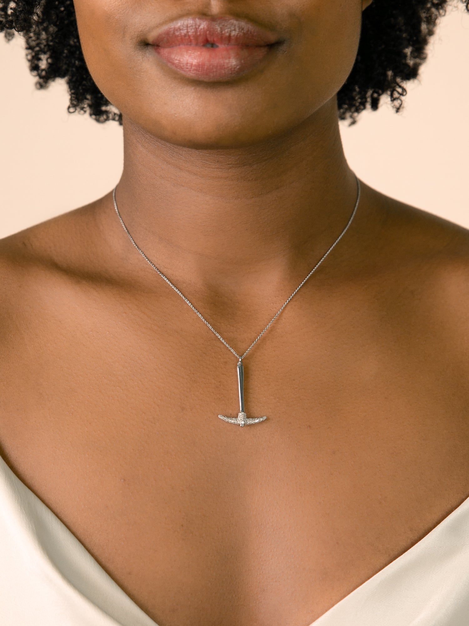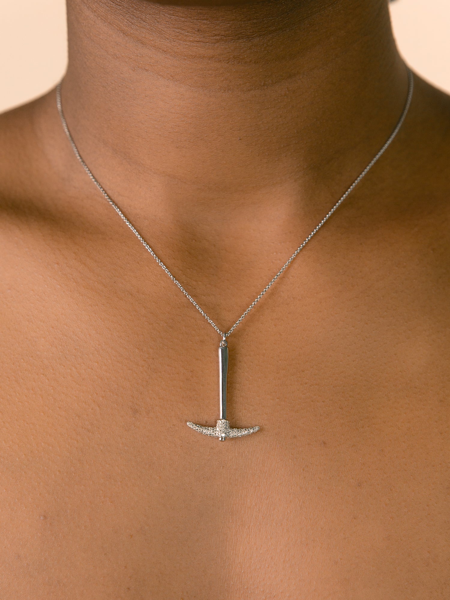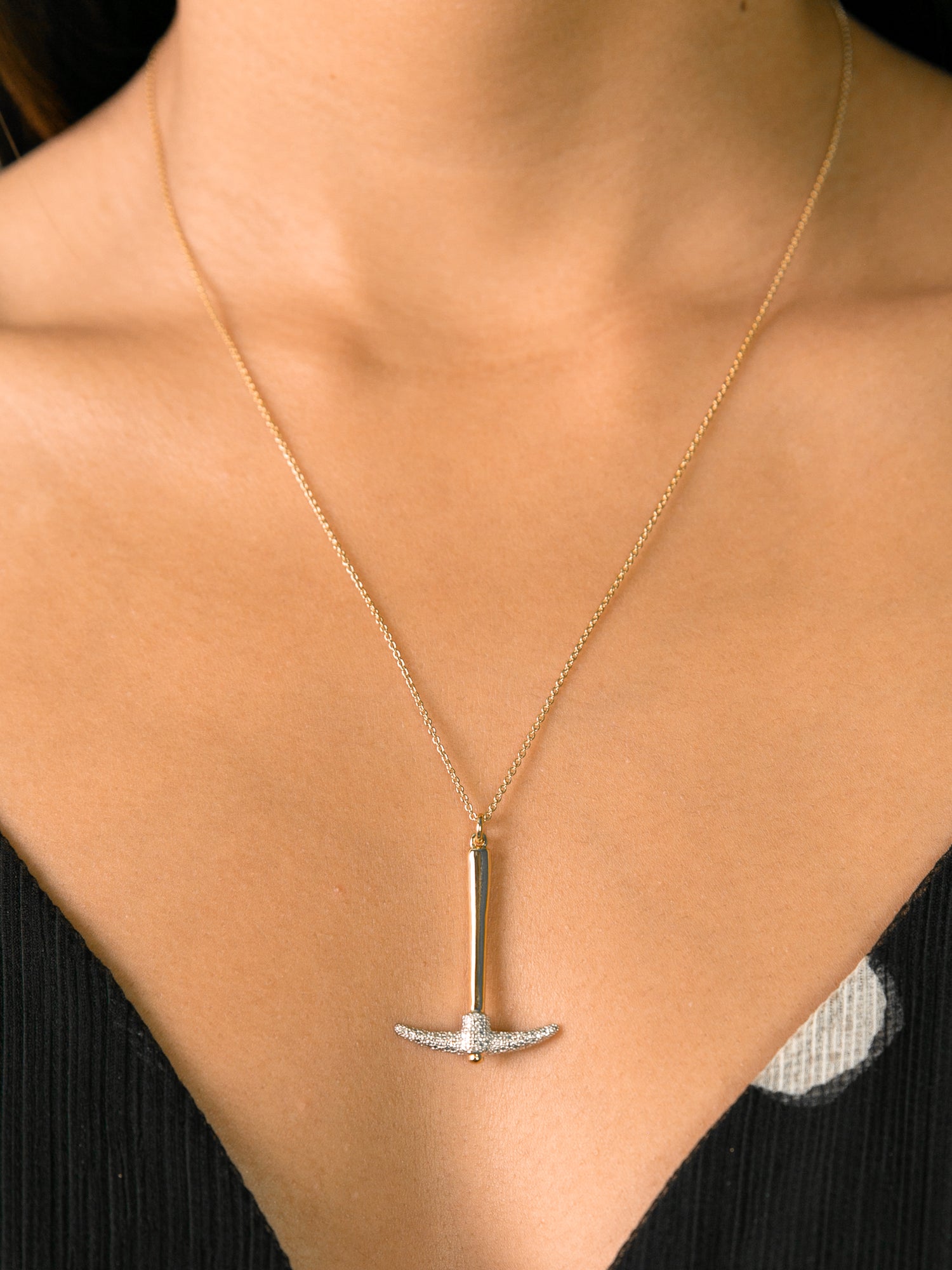 This miniature pickaxe necklace, designed by Joan Hornig for The Female Quotient, is made in 18K yellow gold vermeil, 18K rose gold vermeil or sterling silver with ethically sourced, natural round diamonds. It is hung on an adjustable 20" chain.