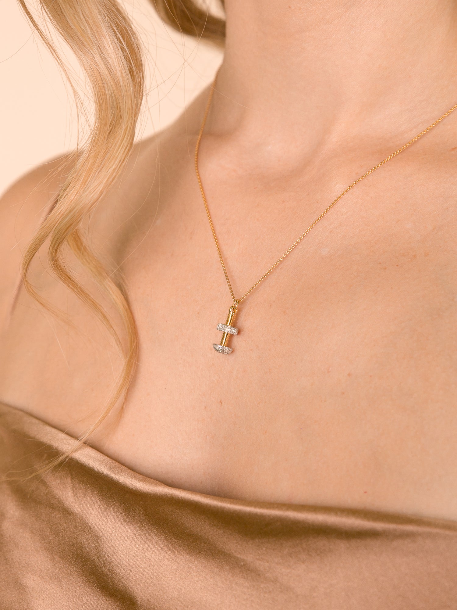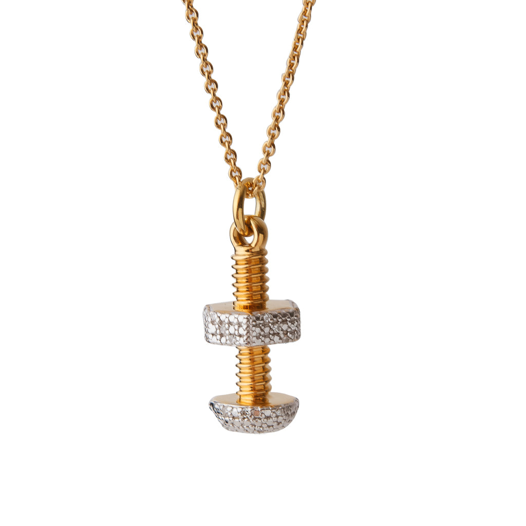 This miniature nut & bolt necklace, designed by Joan Hornig for The Female Quotient, is made in 18K yellow gold vermeil, 18K rose gold vermeil or sterling silver with ethically sourced, natural round diamonds. It is hung on an adjustable 20" chain.