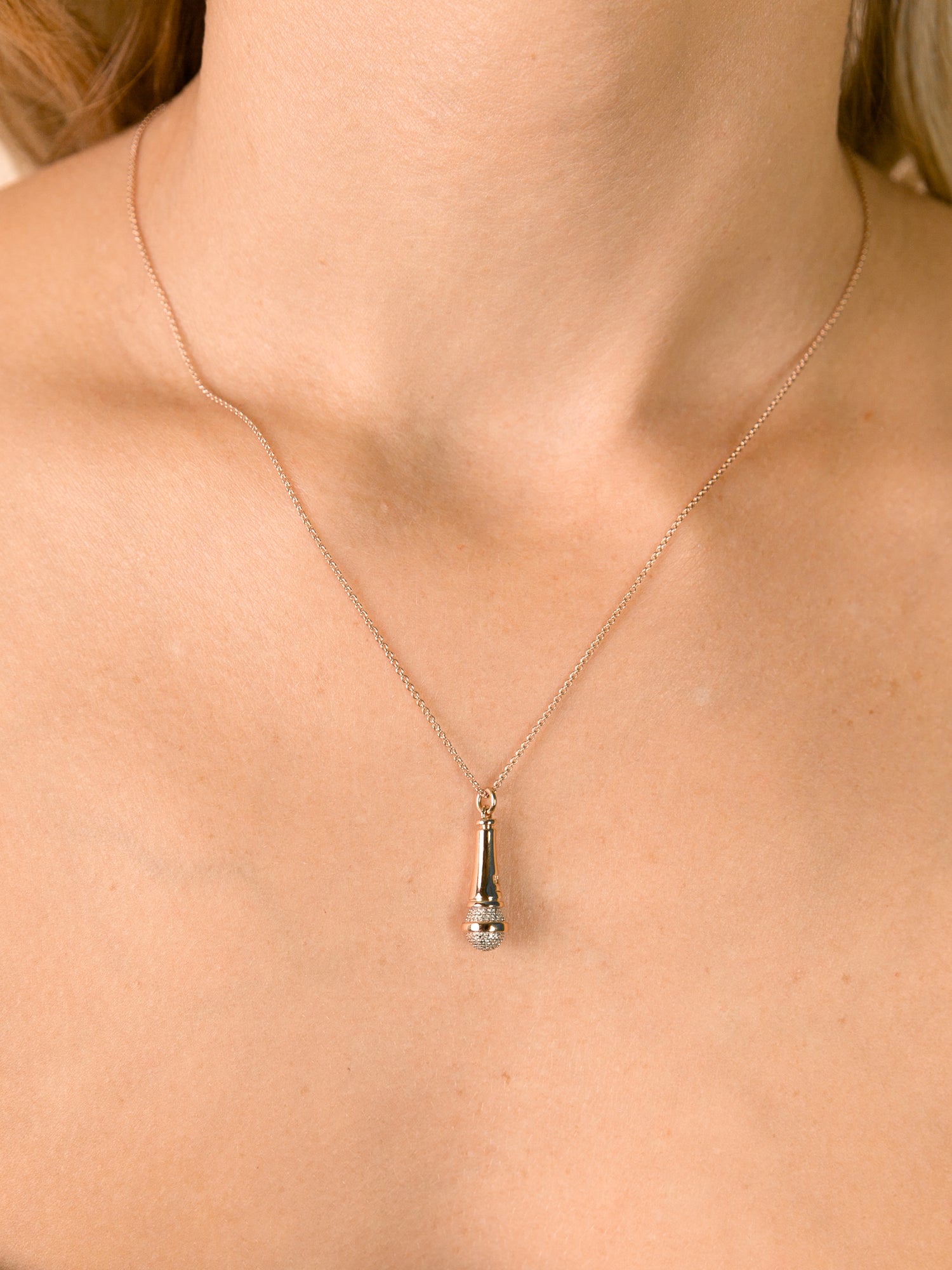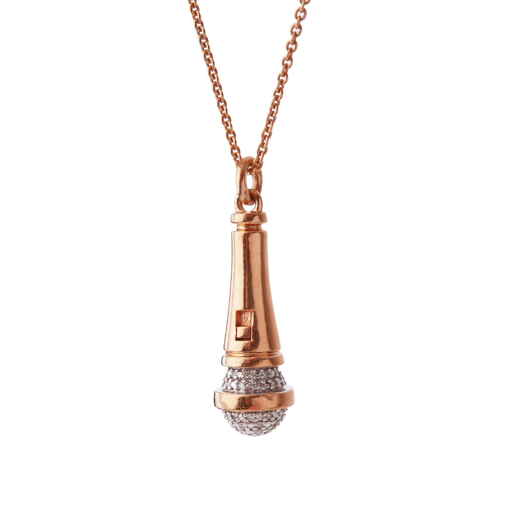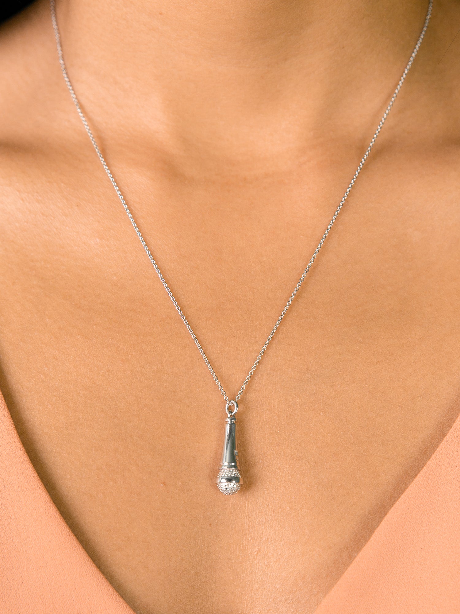 This miniature microphone necklace, designed by Joan Hornig for The Female Quotient, comes in 18K yellow gold vermeil, 18K rose gold vermeil or sterling silver with ethically sourced, natural round diamonds. It is hung on an adjustable 20" chain.