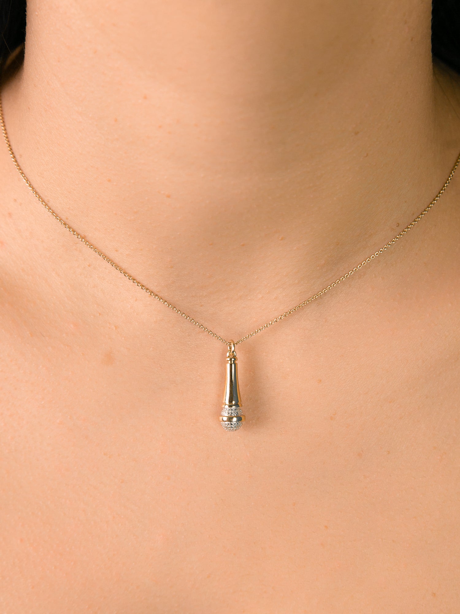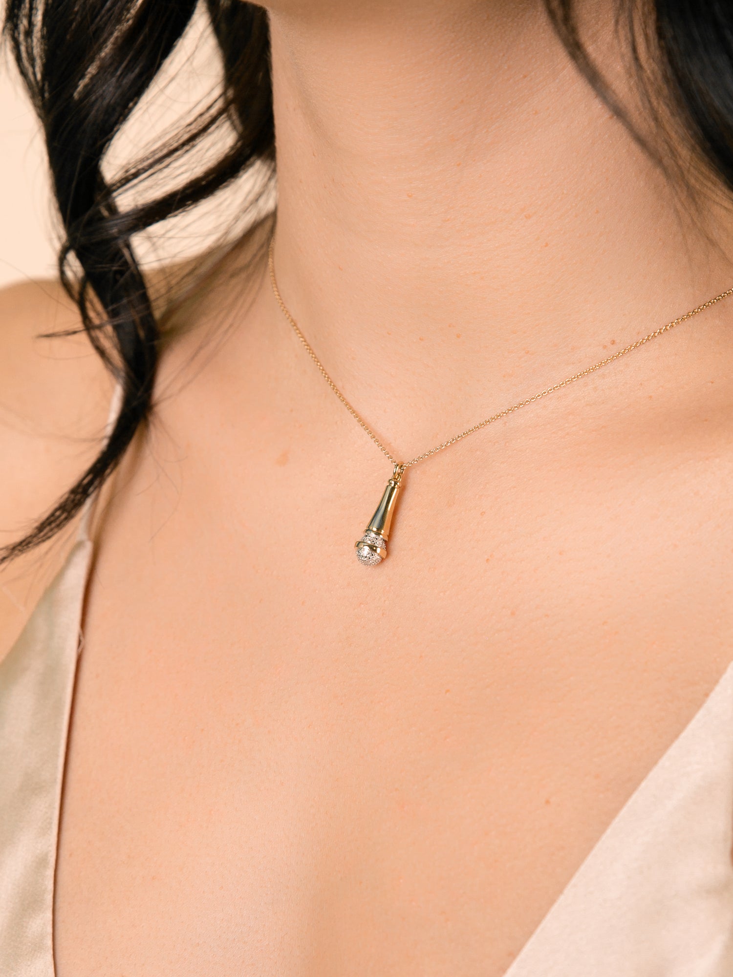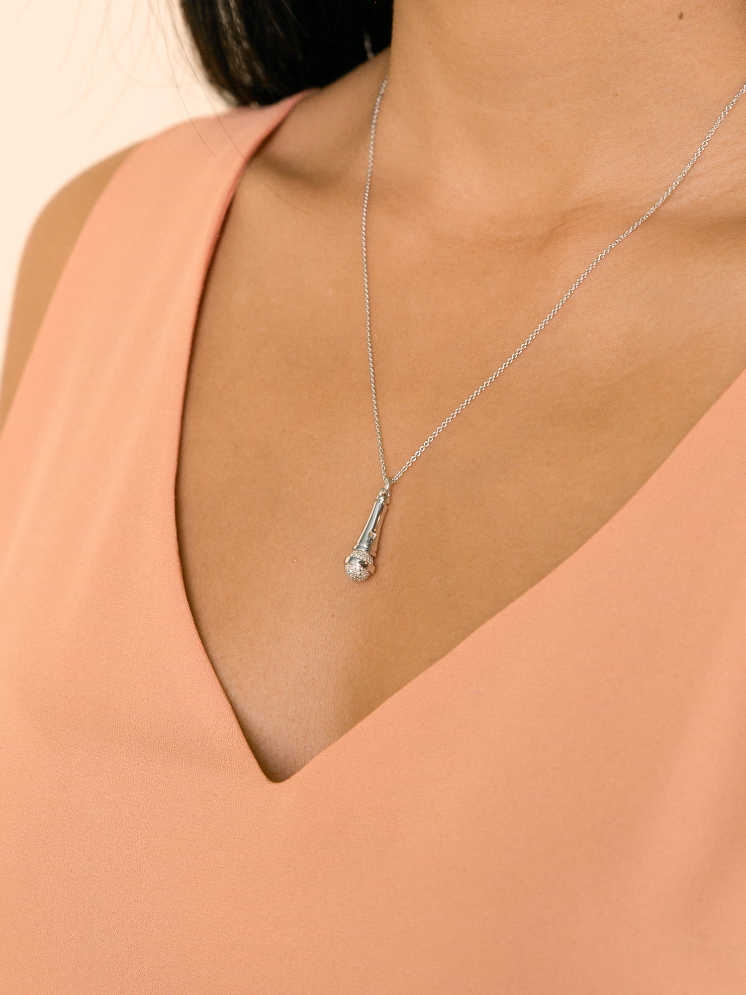This miniature microphone necklace, designed by Joan Hornig for The Female Quotient, comes in 18K yellow gold vermeil, 18K rose gold vermeil or sterling silver with ethically sourced, natural round diamonds. It is hung on an adjustable 20" chain.