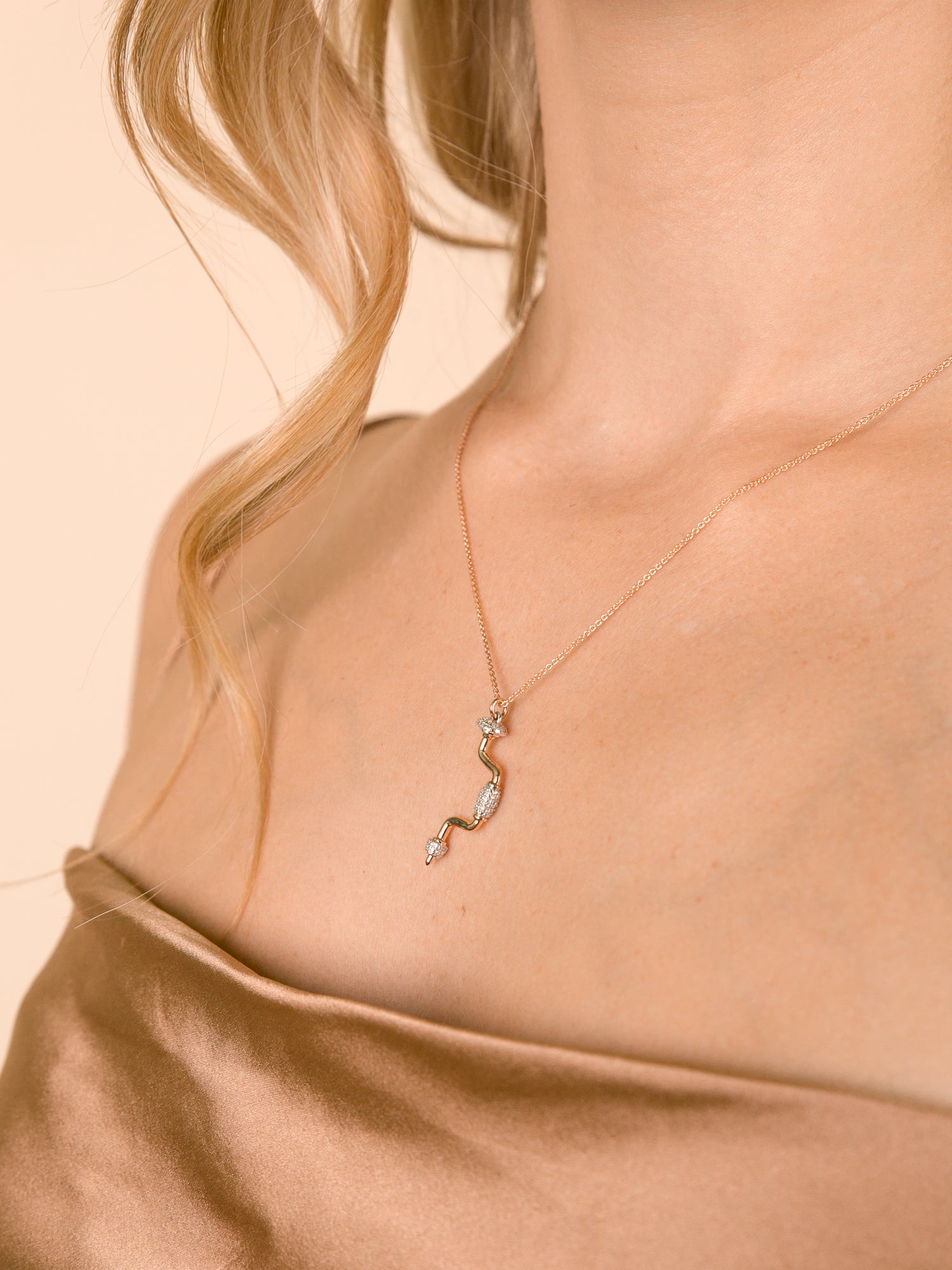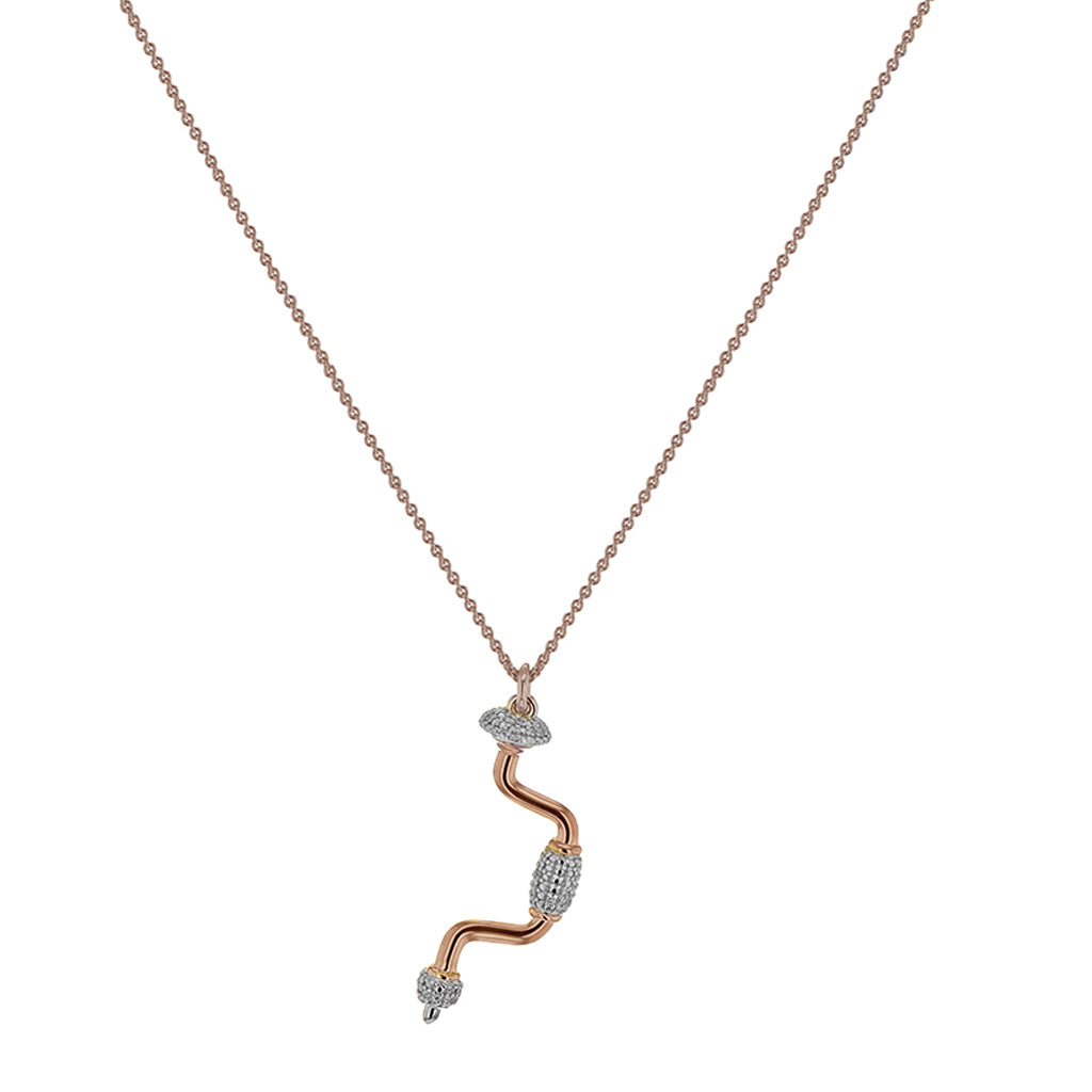 This miniature hand drill necklace, designed by Joan Hornig for The Female Quotient, is made in 18K rose gold vermeil with ethically sourced, natural round diamonds. It is hung on an adjustable 20" chain.
